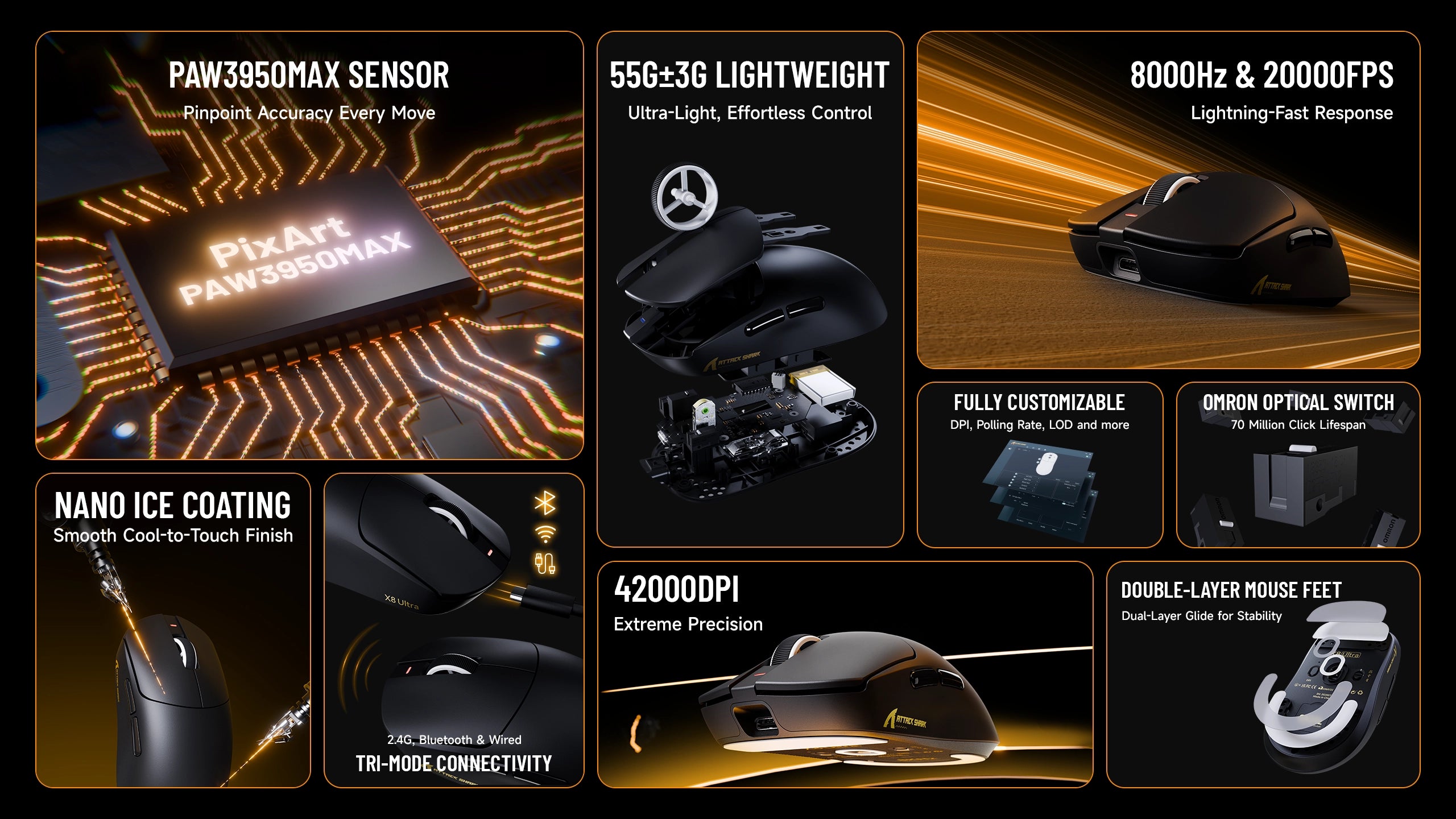 Equipado com o sensor óptico carro-chefe da PixArt, o PAW3950MAX, o X8Ultra oferece precisão incomparável para jogos competitivos. Cada movimento é capturado em tempo real, garantindo um rastreamento impecável mesmo durante os movimentos mais rápidos e jogabilidade em alta velocidade.