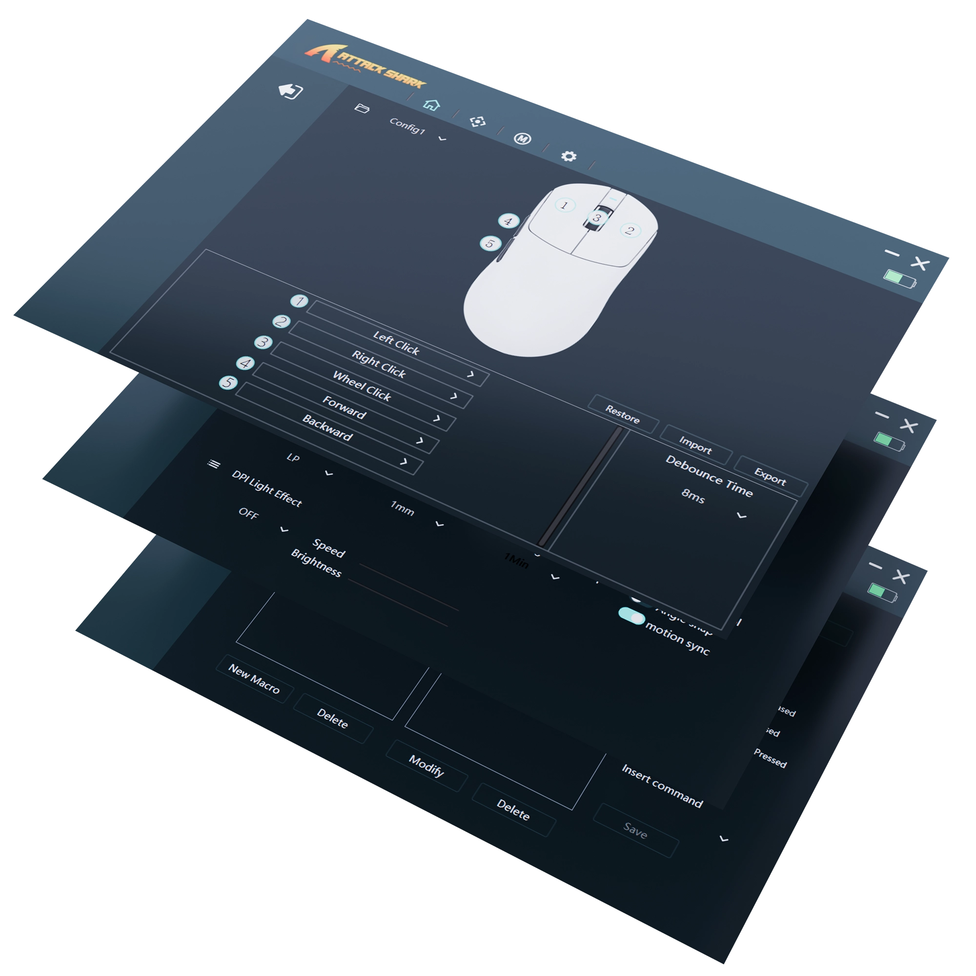 Assuma controle total da sua jogabilidade com o software de driver do X8Ultra. Ajuste botões, DPI, taxa de sondagem (polling rate), distância de levantamento (lift-off distance) e muito mais para combinar perfeitamente com seu estilo de jogo. Cada configuração está ao seu alcance, permitindo que você ajuste o desempenho para máxima precisão e conforto.